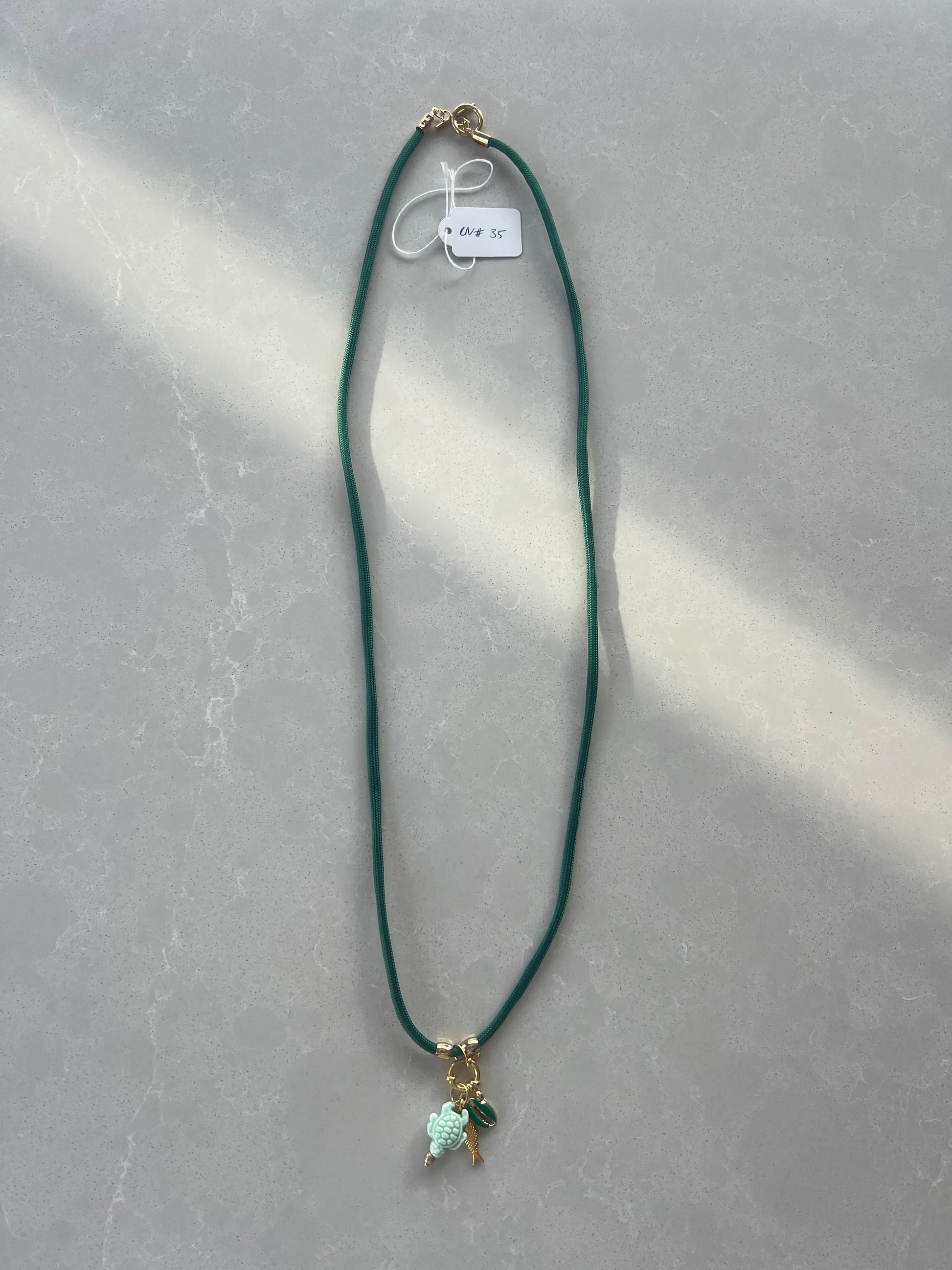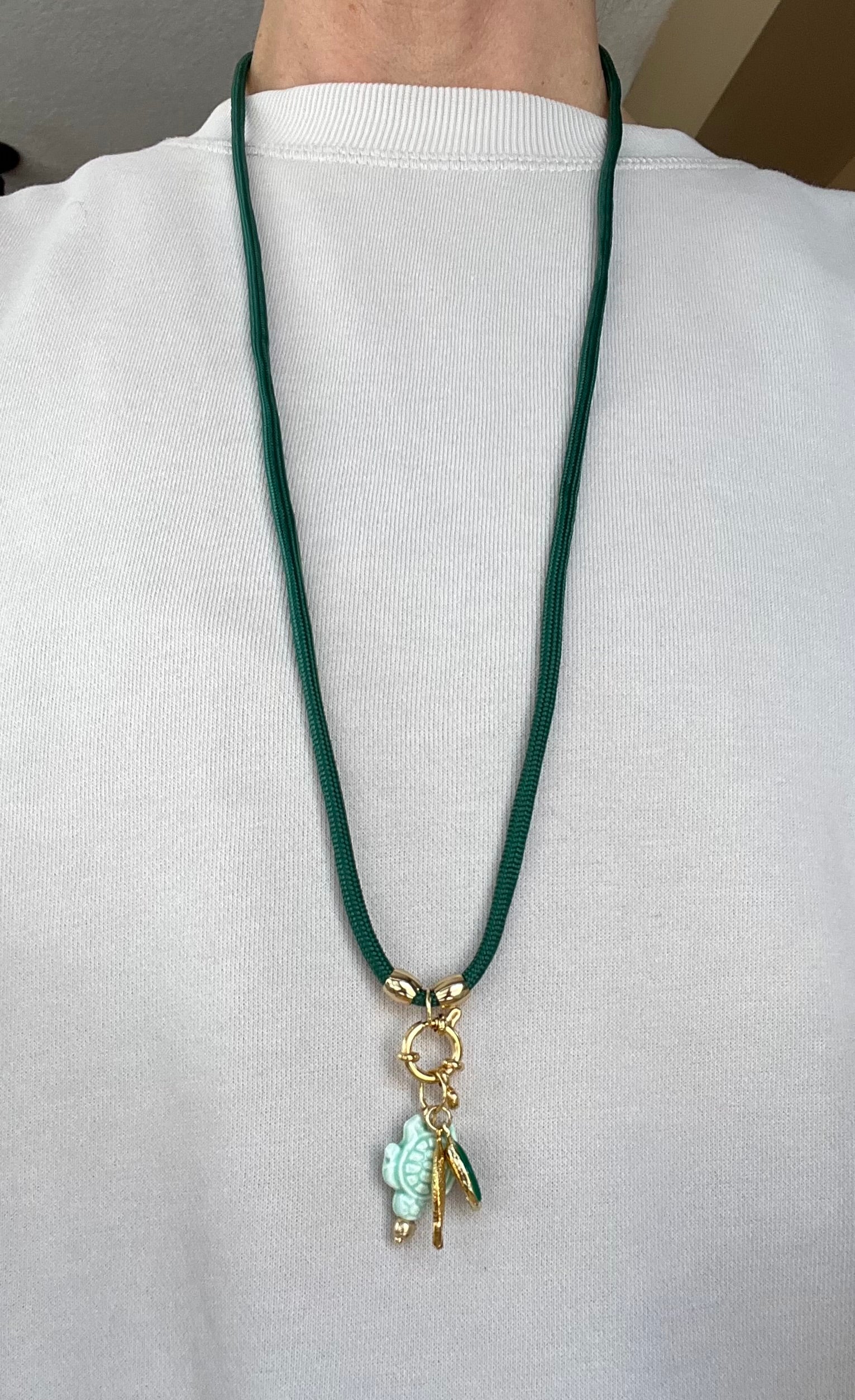 Moss green para cord necklace. Multiple ways to wear, long and short around your neck. Detachable charms